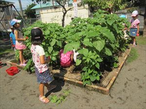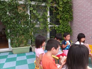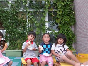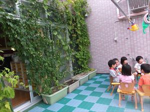 2014.今年のグリーンカーテンは・・・? コメントをどうぞ 今年も2階のプールサイドに植えたゴーヤとひょうたん。 園長先生も、大きくなったゴーヤを採って見せてくれましたね。 涼しげなグリーンカーテンの前で、おやつもおいしいね!