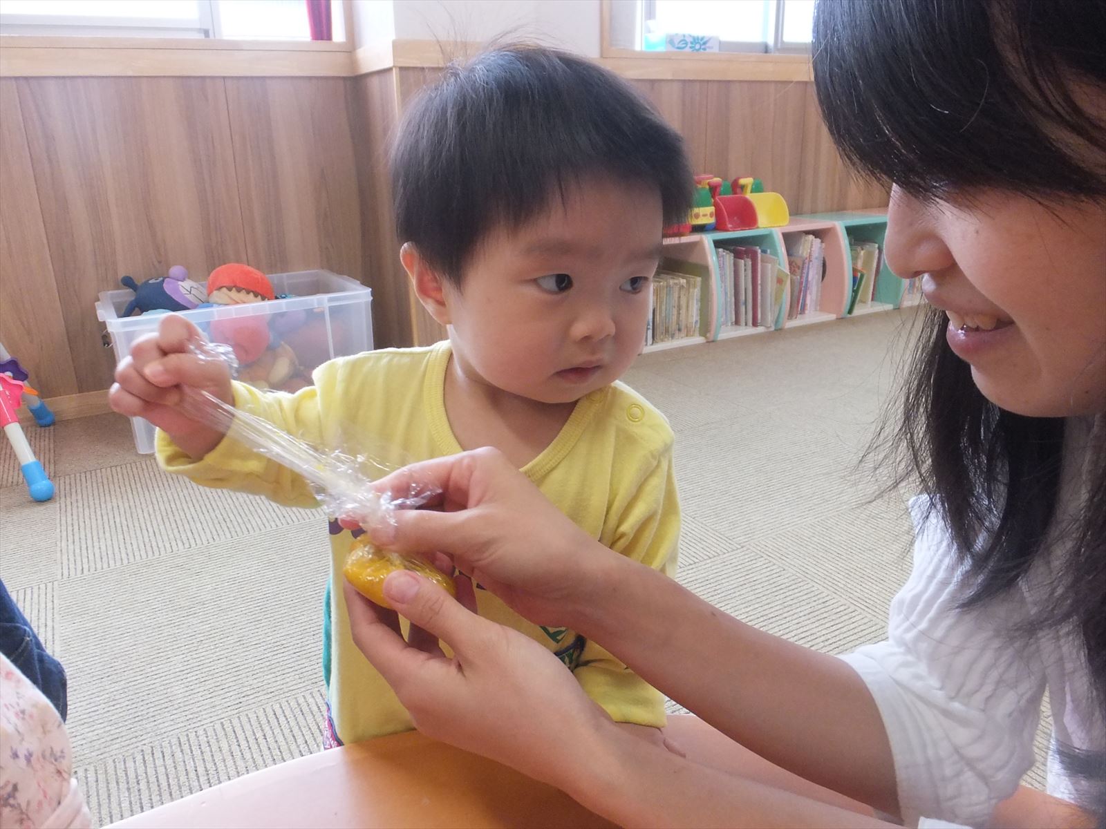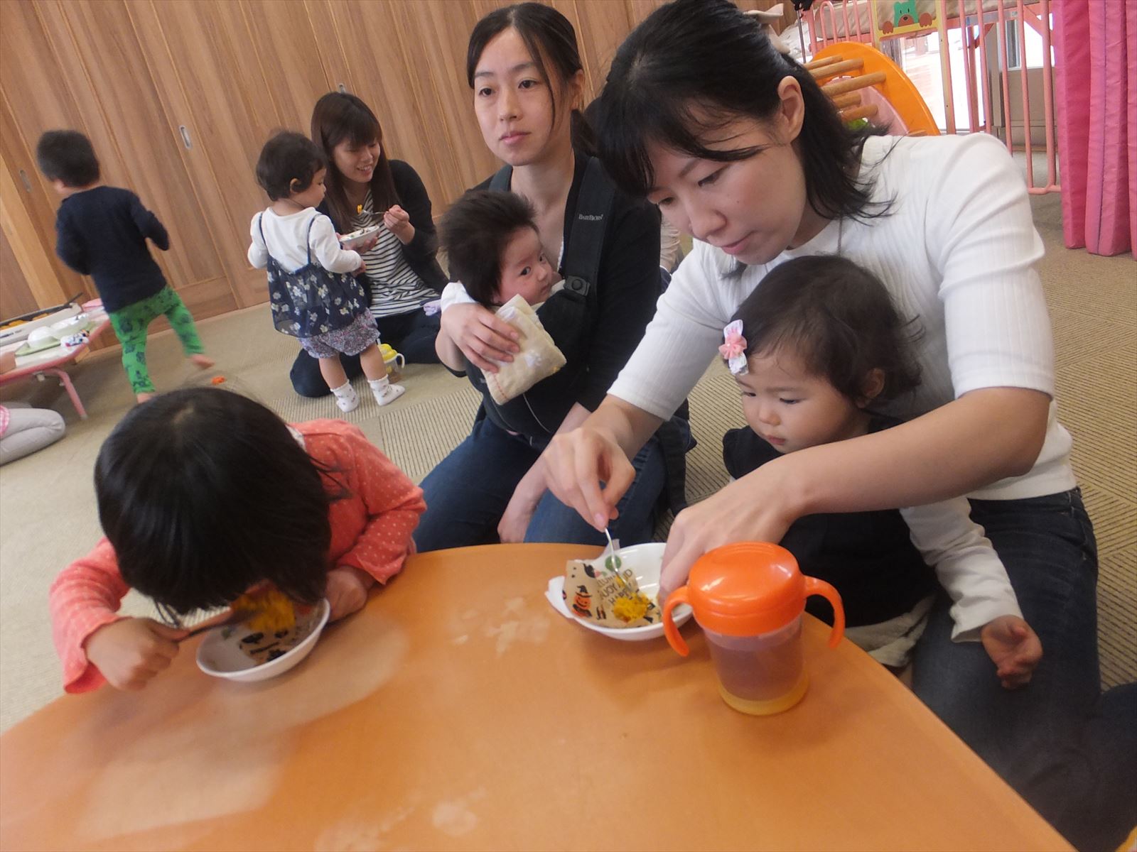 お腹が空いたところでおやつタイム。かぼちゃのお焼きもいい匂い!ちびっ子たちの元気な「おかわり!」の声が響きます♪