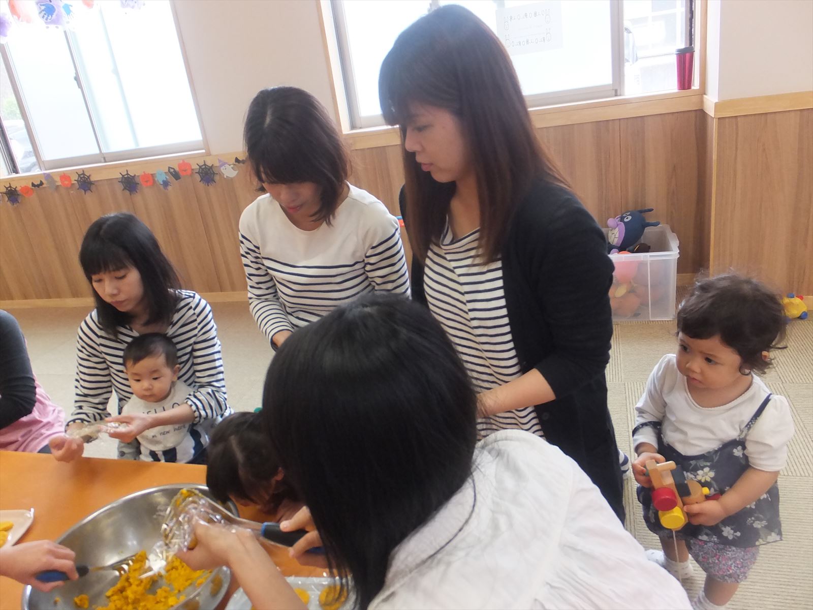 まずはクッキング。ハロウィンにちなんで今日はかぼちゃのお焼きです。蒸かした南瓜をつぶしながら片栗粉少々。丸く平らに形を整えたらゴマを振ります。あとはホットプレートで焼くだけ!かぼちゃの自然な甘みが美味しい、秋の味覚です。
